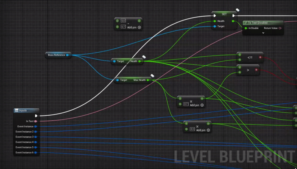 So here’s what I had to do. The first thing was get access to the boss’ health. This split it into two values. The boss’ current health and the boss’ max health. When the current health was lower than a certain percentage of the max health, the Intensity parameter would increase to allow the next layer of music to be added on. It works like this:If the current health is less than or equal to max health, set Intensity to 1. This allows the first layer to be played.If the current health is less than max health BUT below or equal to 70% of the max health, increase Intensity to 2. This adds on the second layer so now the player can hear the first and second layer.If the current health is less than max health BUT below or equal to 30% of the max health, increase Intensity to 3. This adds on the third and final layer so now the player can hear layers 1, 2 and 3.