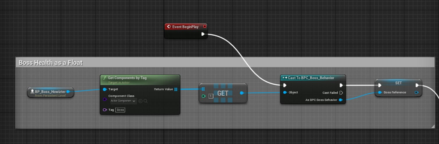 The biggest challenge with this was getting access to the boss’ health. Thankfully, our programmer was more than willing to help me accomplish this. As it turns out, you have to make a reference to the boss object in the scene and then get the actor component. Then you can cast to the boss behavior to access the health.