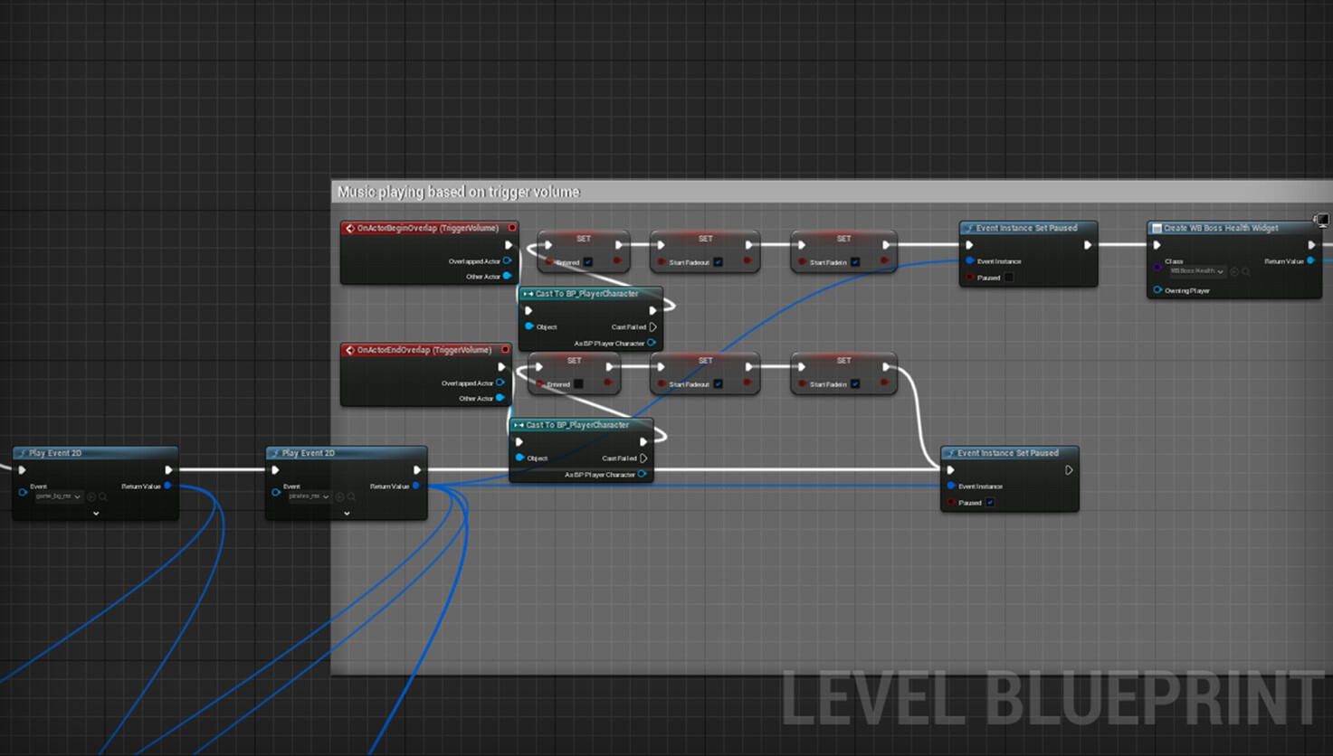 The FMOD file is connected to the build and the boss music event is accessible in Unreal 5. The next step is figuring out exactly how the music will be set up in the build to allow the game it self to affect the Intensity parameter. The first challenge was figuring out how to control the playing of the music. I decided to set up a trigger box around the boss area so that when the player enters the box, the background music stops while the boss music starts and vice versa when they leave the box. In addition, I worked with our programmer to set up variables that allowed the music to fade in and out instead of just cutting each other off.