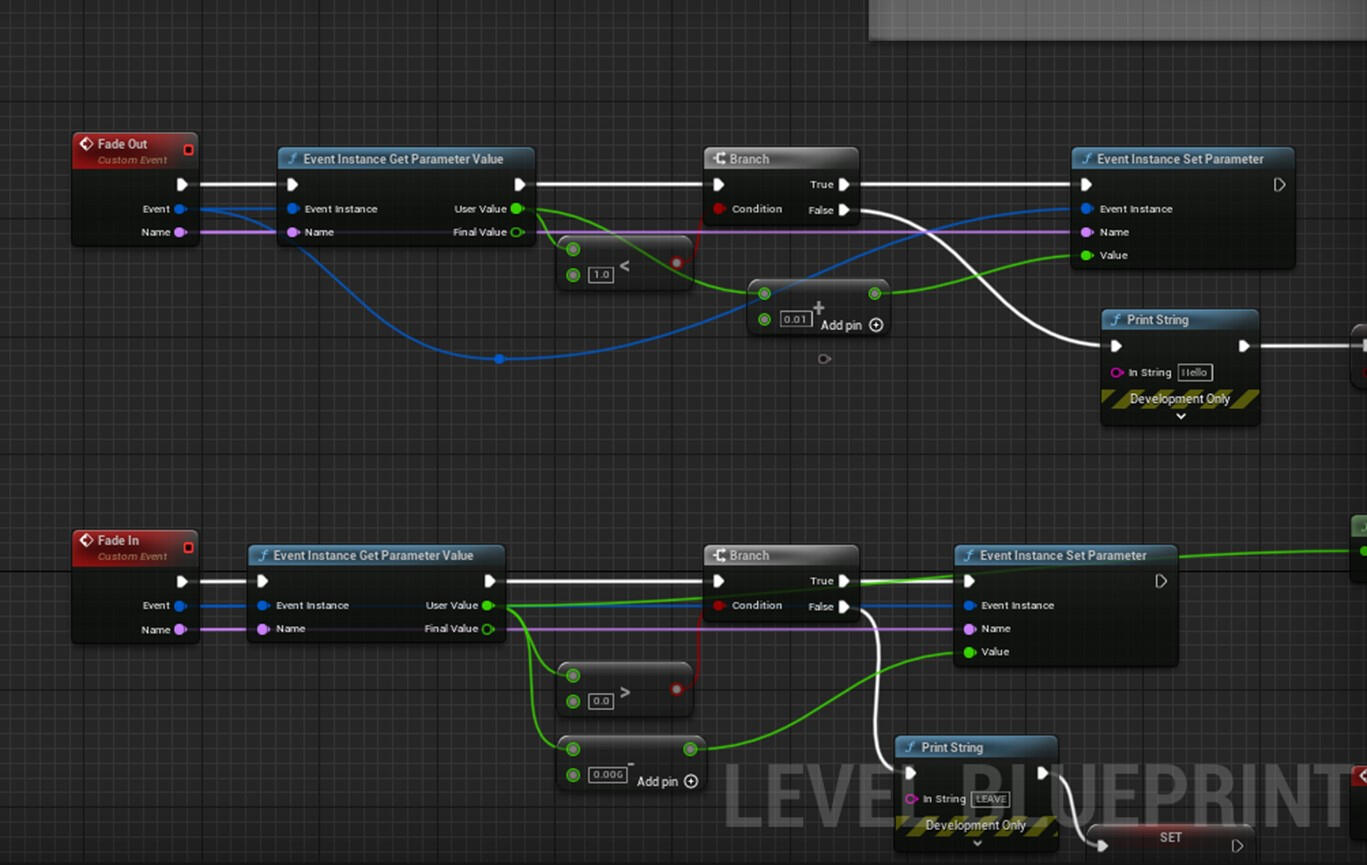 The image above is the set up for the trigger box controlling the music. The image below shows the fade out and fade in variable being set up to allow the music tracks to gently fade in and out. This was crucial to set up first so I didn’t run into playing issues later.